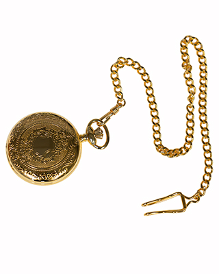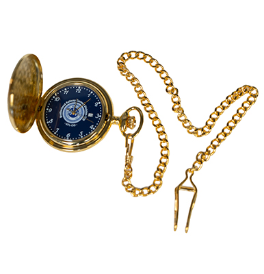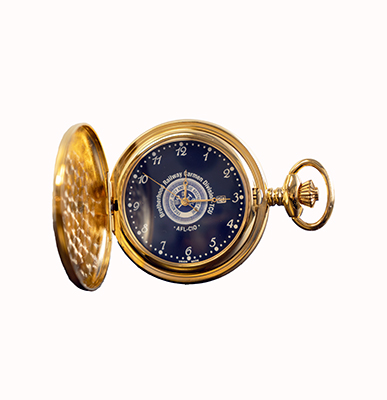 American Times pocket watch in brushed gold with matching gold chain. Features the BRC logo.